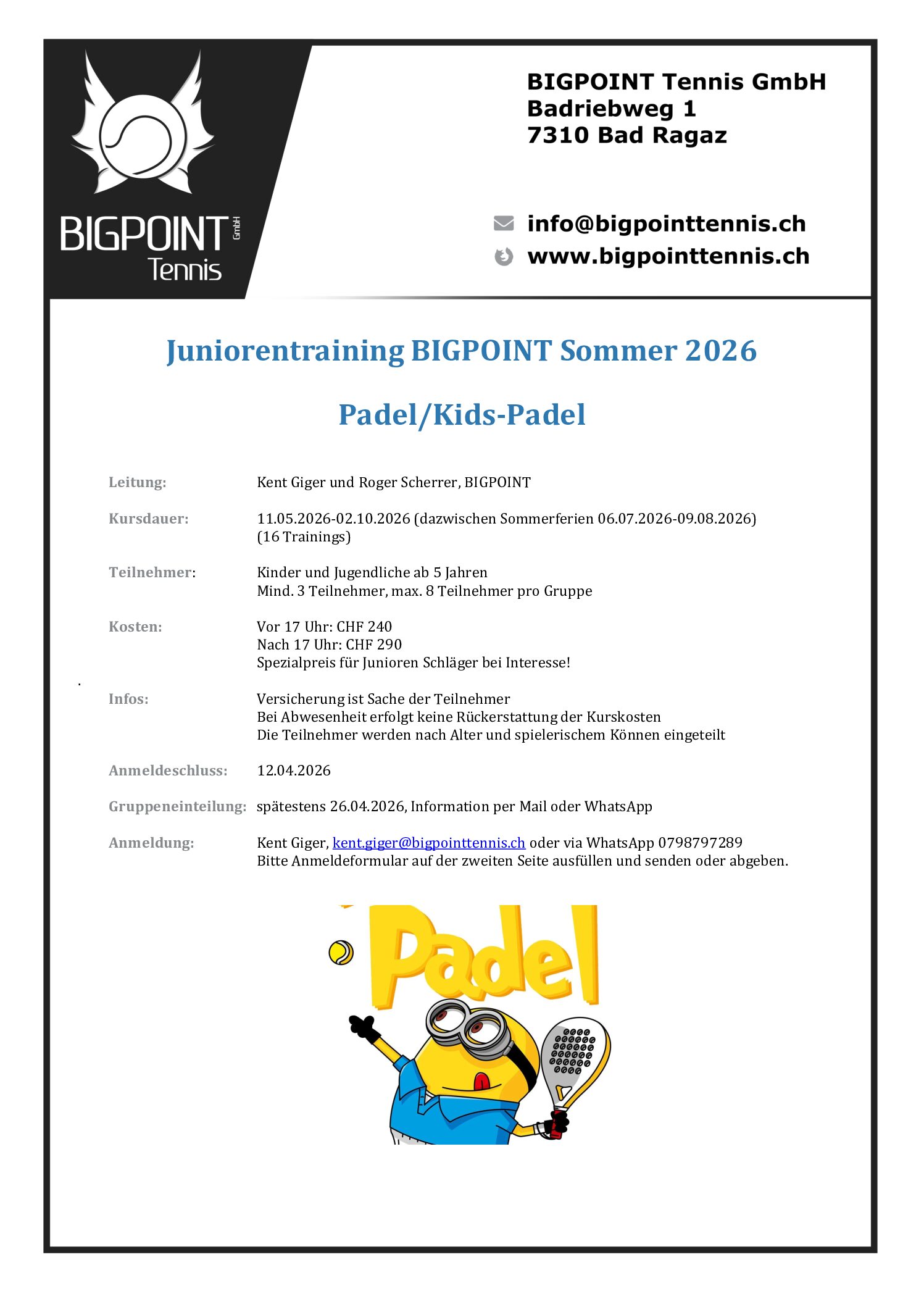 Die BIGPOINT Tennis GmbH in Bad Ragaz ist Ihr renommierter Ansprechpartner für hochwertige Sportanlagen und Unterricht in verschiedenen Racketsportarten. Unsere Coaches sind top ausgebildet und unterstützen Sie, Ihre Ziele zu erreichen. Denn Racketsport ist unsere Leidenschaft. Mit insgesamt 9 Padel Courts, darunter zwei Einzel Courts, 2 Tennis Courts, einem Pickleball Court und einem Badminton Court sind wir für Racketsportliebhaber bestens vorbereitet.