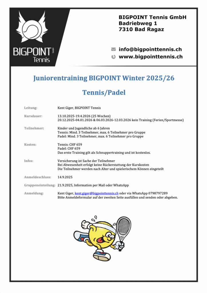 Junioren bis 16 Jahre, welche bei uns im Sommer- oder Wintertraining teilnehmen, haben von Montag bis Sonntag (06:30-18:30 Uhr) 75% Rabatt auf den eigenen Anteil dieser Einzelplatzmieten: